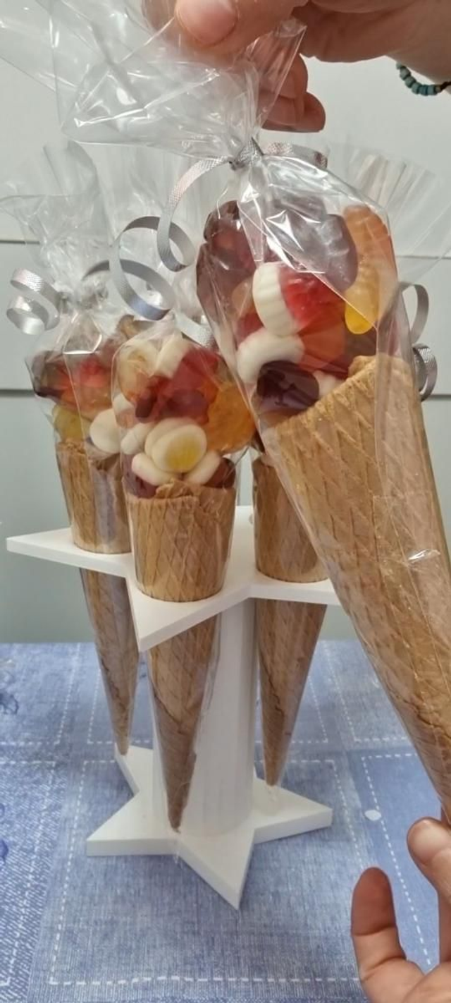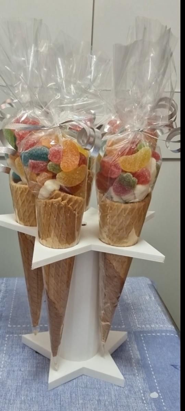 Cono de barquillo de helado relleno de mini gominolas. Un precioso detalle para un día especial.