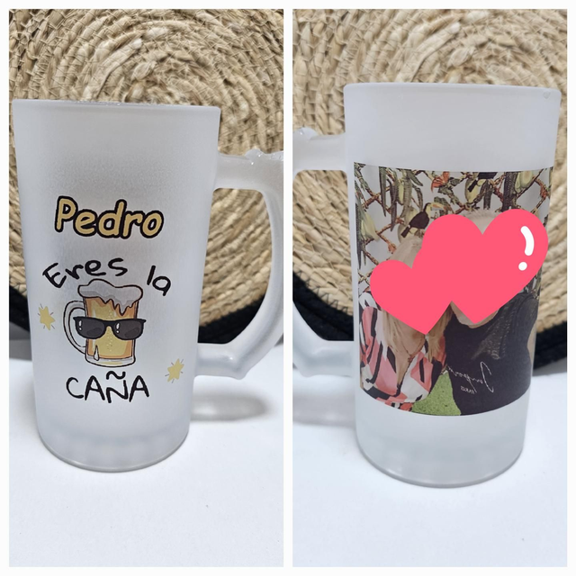 Jarra de cerveza de cristal grueso y opaco personalizada con foto o diseño preferido. Pídela y mándanos por WhatsApp al 611440385 el nombre, diseño o déjalo al final de proceso de compra en el apartado "comentarios para el comerciante". Si es foto tendrás que mandarla por WhatsApp.